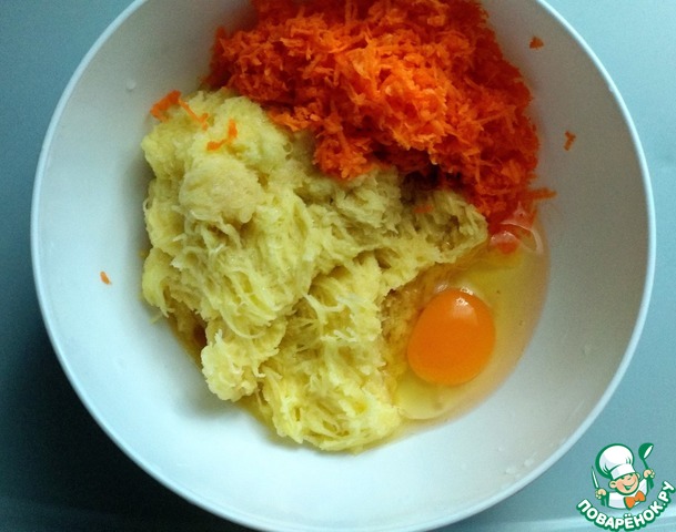 Картофель и морковь помыть, почистить, натереть на мелкой тёрке. Добавить яйцо и соль. Перемешать.