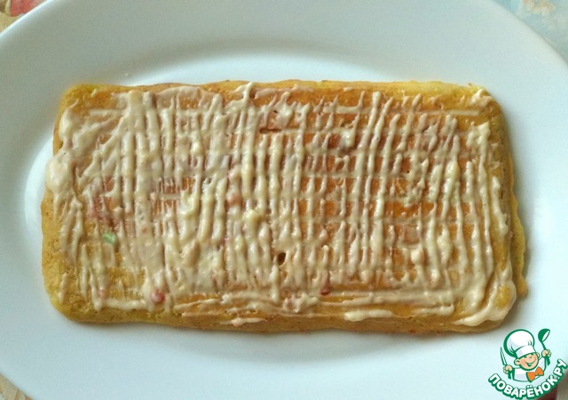 Сметану ( или майонез) смешать с чесноком, выдавленным через пресс. Смазать первый корж.