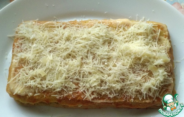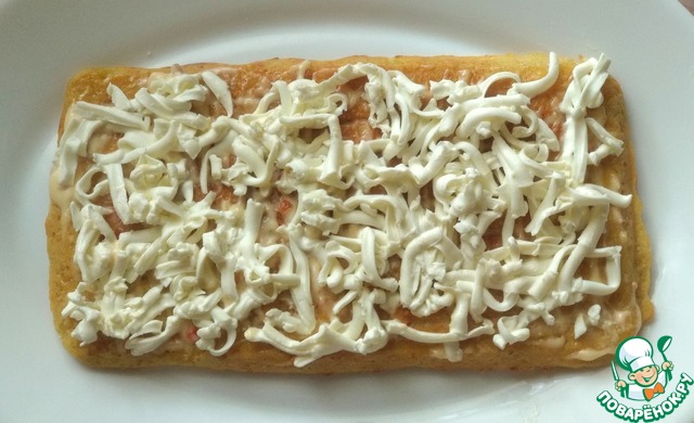 Далее положить второй корж, смазать сметаной с чесноком. Натереть сыр на мелкой тёрке.