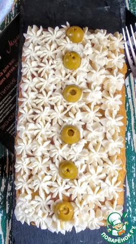 Сверху укладываем третий корж. Опять смазываем и распределяем творожный сыр, я выдавила через кондитерский шприц. И украсила оливками.