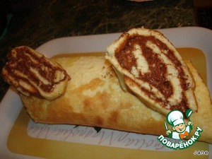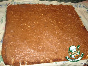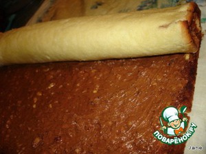 Охлажденный бисквит развернуть, смазать шоколадным кремом.