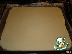 Противень смазать маслом, выложить пергаментной бумагой и посыпать манкой (или мукой).