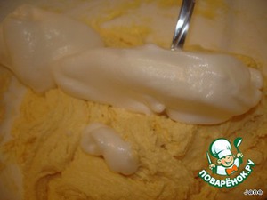 Отдельно взбить белки в густую пену, добавив остатки сахарной пудры.