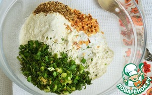 Вмешать рубленную зелень, грибной порошок, сушёный (жареный) лук.