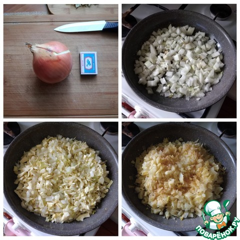 Делаем начинку. На фото я показала, в сравнении спичечного коробка, какую я луковицу приготовила для начинки в пирог. Наливаем масло на сковороду, ставим на плиту, греем его и выкладываем мелко порезанный лук. Немного обжариваем до мягкости. Не зажаривайте сильно, а-то не будет вкусно. К луку выкладываем капусту белокочанную тоже мелко порезанную. Готовим до готовности. Я сильно не обжаривала, делала на минимальном огне при закрытой крышке. В конце посолила и поперчила. Перчить не обязательно, если есть будут дети. Я поперчила молотым перцем-кайен.