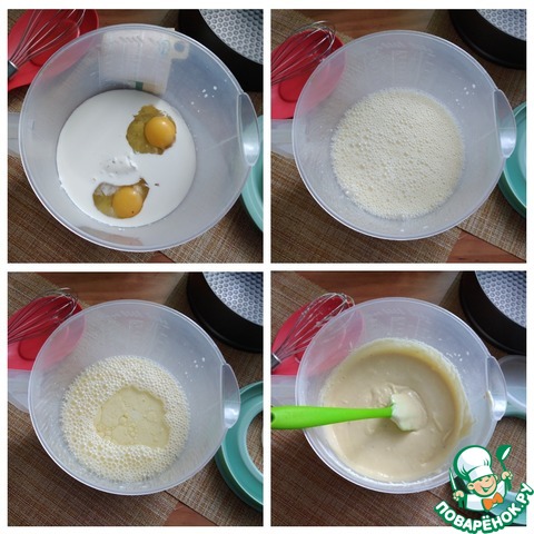 Паралельно делаем тесто. Сливки немного нагрела, положила сахар, ложку творожного сыра и разбила 2 яйца. Немного взобью массу электрическим венчиком. Можно для замеса теста использовать кухонную машину. Добавила масло подсолнечное и опять всё взбила. Соединила муку с разрыхлителем и просеяла в смесь. Венчиком соединяла муку маленькими порциями, положила соль. Тесто готово. По консистенции похоже на сгущённое молоко.
