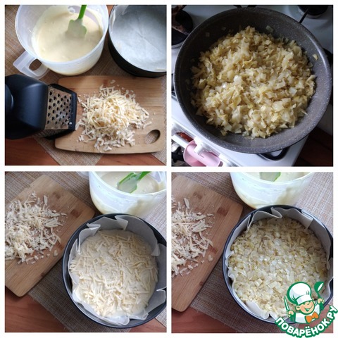 Начинка из лука и капусты готова. Натираем сыр на тёрке. Сыром пирог не испортишь и его можно взять побольше. Я взяла разъёмную форму D-20 см и высотой-6 см. Форму можно взять любую такого диаметра, какая у вас есть: силиконовая; керамическая... Я свою форму проложу пекарской бумагой. Бумагу немного пропитаю маслом. Визуально делим тесто пополам и на низ формы выливаем половину. Силиконовой лопаточкой я распределила тесто равномерно. Присыпаем половиной натёртого сыра. Далее-толстый слой луково-капустной начинки. Разравниваем.