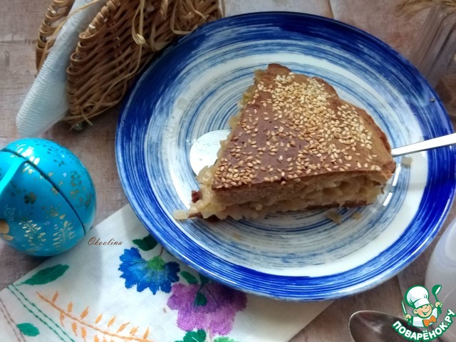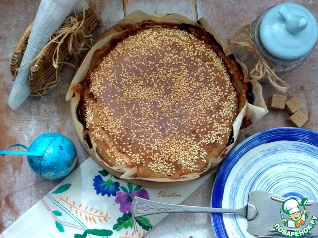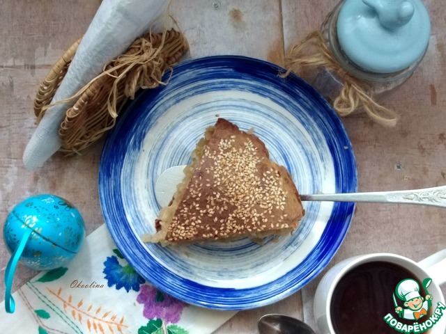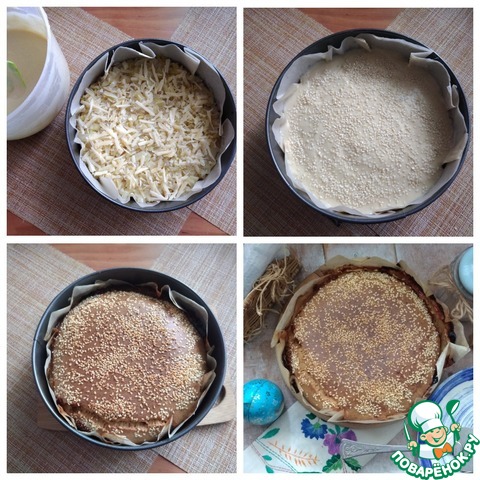 Выкладываем опять сыр и заливаем второй половиной теста. Сверху присыпаем щедро кунжутом. Ставим в духовку разогретую до т-180 С на 40 минут. Пробуем на "сухую лучину". Тесто к лучине не пристаёт, а значит пирог готов. Ориентируйтесь на свою духовку. У меня небольшой электрический шкаф на 18 л, печёт очень быстро и хорошо. Даём пирогу немного остыть.