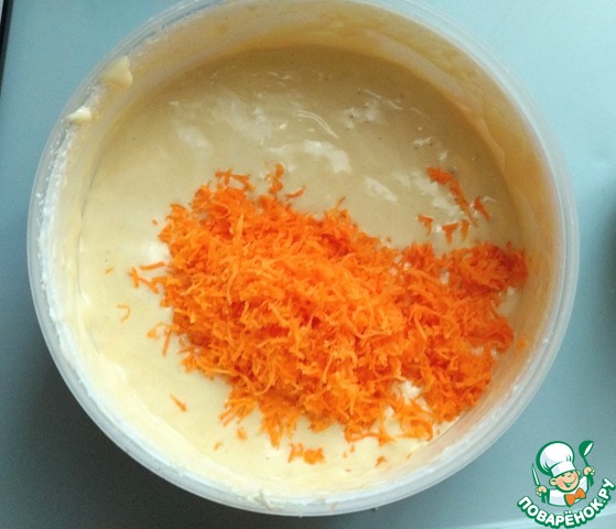 Морковь помыть, почистить и натереть на мелкой тёрке, добавить в тесто, перемешать.