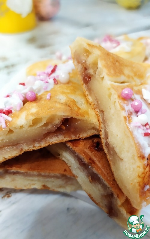 Сверху положить тесто. Закрыть мультипекарь и выпекать 6 минут. Если вы печете на сковороде, то печь с каждой стороны по 3-4 минуты, до румяной корочки.