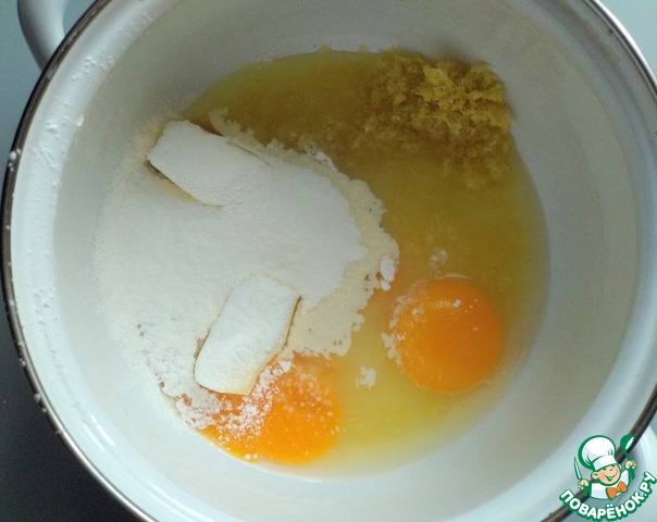 • В кастрюльке соединить цедру лимона, лимонный сок, желтки, сахар, масло сливочное, кукурузный крахмал.