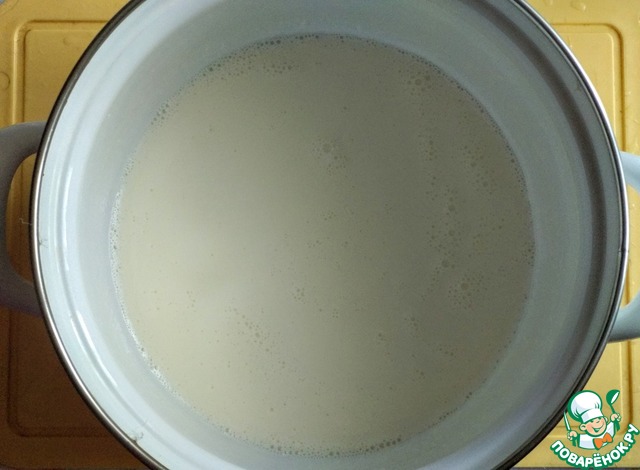 • Далее в кастрюльке соединить сливки, молоко, сахар, ванилин и желатин (у меня порошковый). Поставить на огонь, помешивая веничком, дождаться пока растворится желатин, примерно до 60-70 градусов (не кипятить!!!). Снять с огня.