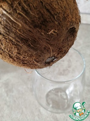 Подготовим кокос. Делаем ножом дырочку и сливаем жидкость.