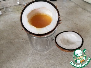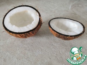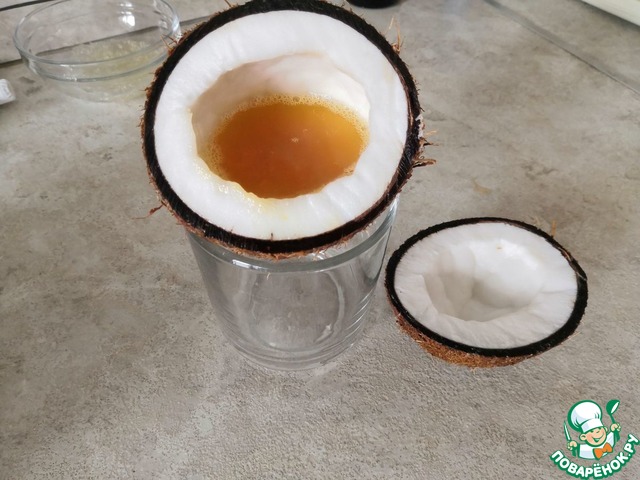 Заливаем нашу смесь в половинку кокоса и убираем в холодильник до застывания желе.