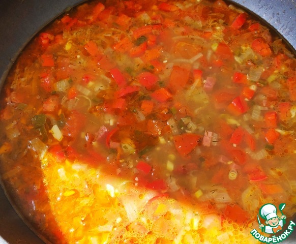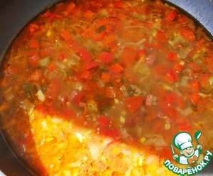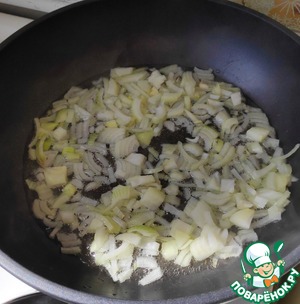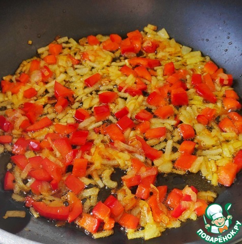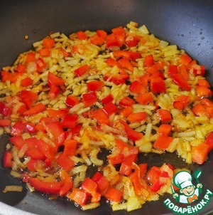 Когда лук начал обжариваться, добавляем болгарский перец. Жарим их вместе пока лук не дойдет до золотистого цвета.