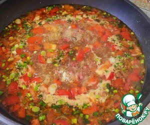 Раскладывать по тарелкам удобнее сначала овощную гущу. Делаем это деревянной ложкой, чтобы не царапать сковороду. Потом наверх выкладываем яйца (удобно аккуратно выловить шумовкой). Разливаем остатки бульона.