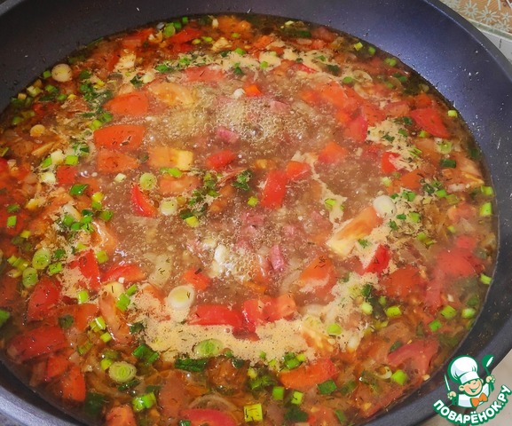 Добавляем воду из закипевшего чайника 0,5 литра, даем закипеть. Убавляем нагрев, засыпаем мясо, средне-порубленный чеснок, ждем закипания и варим 5 мин.