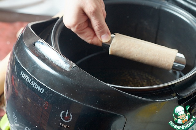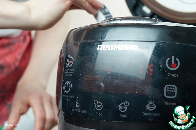 Влить в чашу мультиварки Redmond 1 литр рафинированного масла. Выбрать режим "Мультиповар" 170С. 1 час. Дождаться, когда масло дойдет до нужной температуры, измеряя ее с помощью термощупа.