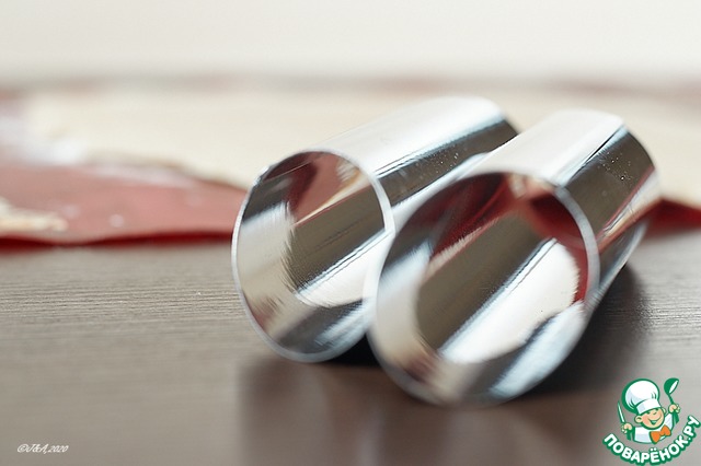 Оберните заготовки вокруг трубочек, склейте белком, прижав швом к столу для прочности.