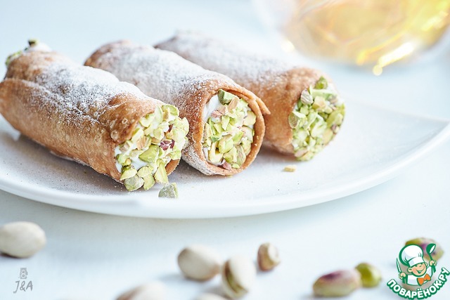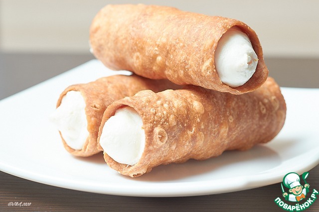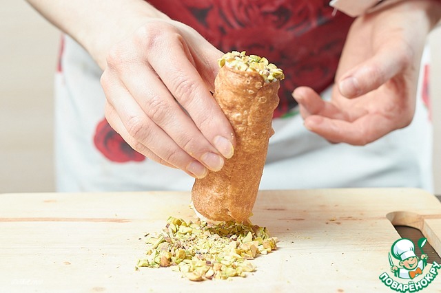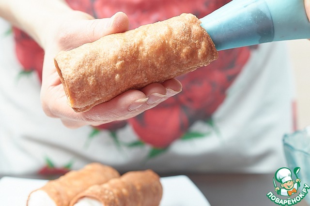 Наполните канноли кремом из мешка с насадкой. Нельзя заранее начинять трубочки, они размокнут, только перед самой подачей.