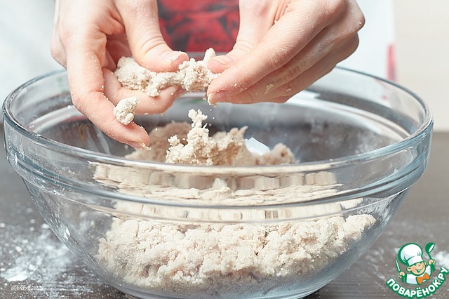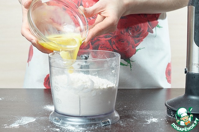 Добавьте в крошку яйца. Одно целое и один желток. Они должны быть холодными.