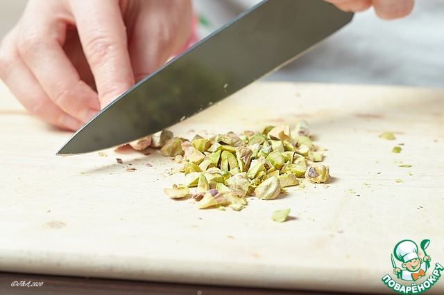 Топинг может быть любой- рубленный шоколад, миндаль или фундук, или кокосовая стружка. А по-классике- это фисташки.