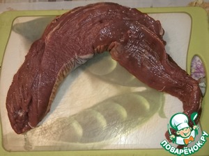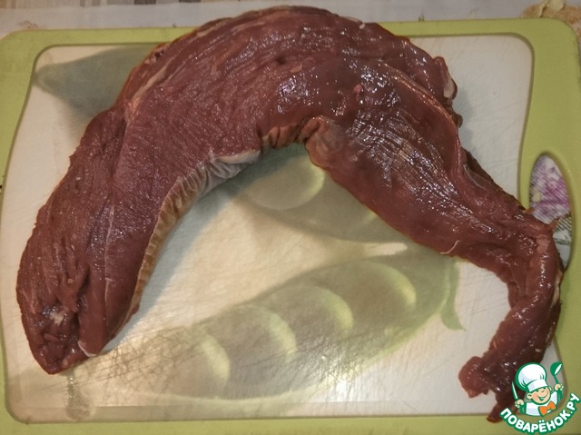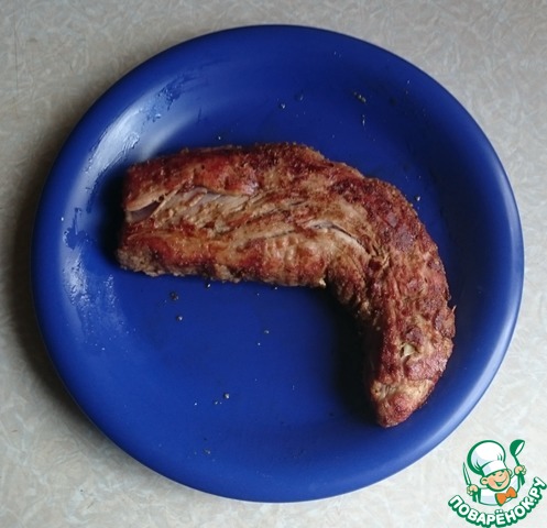 Через час - два достаём мясо и обжариваем на сковороде в разогретом масле с обеих сторон. Как любят говорить профессионалы - запечатываем. Минут по 5 с каждой стороны. Внутри мясо остаётся сырым!