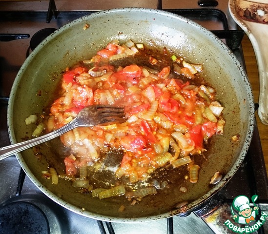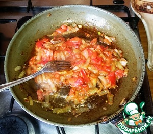 Хорошо разогреваем сковороду, добавляем немного растительного масла и обжариваем лук до золотистого цвета, добавляем помидоры.