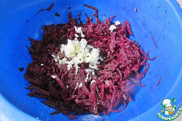 Из замаринованной свеклы сливаем лишний сок, если его действительно много. Добавляем специи. Не перемешиваем!