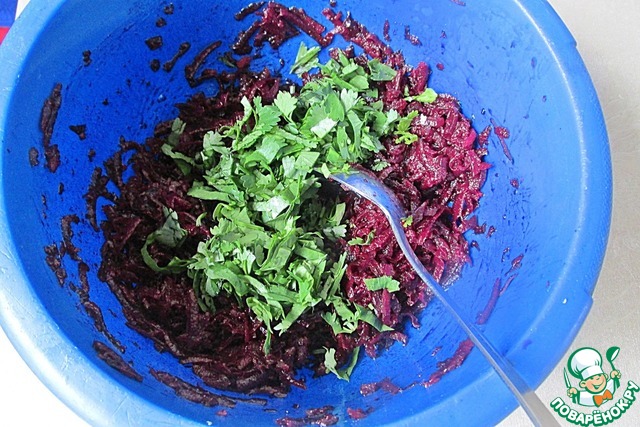 Добавляем измельченную зелень кинзы, перемешиваем.