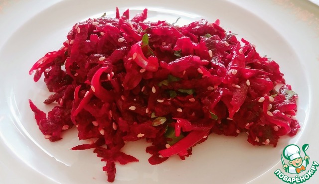 Выкладываем свекольный салат в салатник, присыпаем кунжутом, украшаем веточкой кинзы.