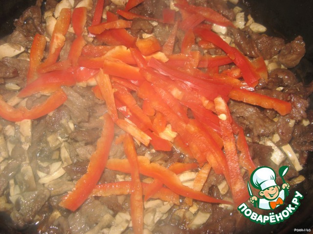 Готовое мясо обжариваем на растительном масле до коричневого цвета,добавляем нарезанные грибы,
