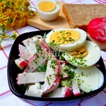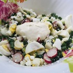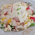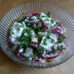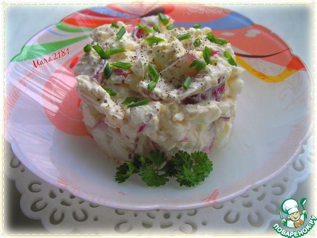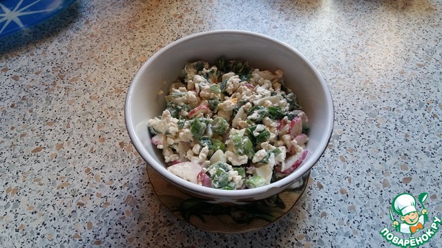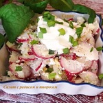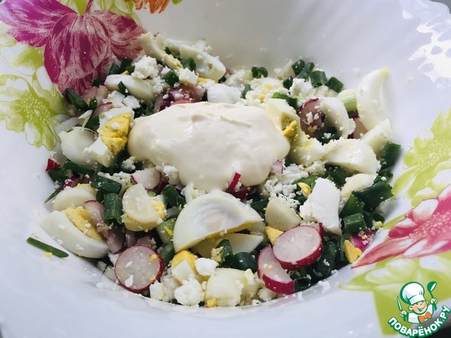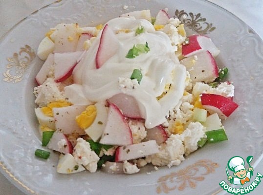 Наступил новый сезон редиски. И салаты с ней сейчас часто на нашем столе. Хочу предложить отличный вариант салата с редиской, яйцами, творогом и зелёным луком. Пробуйте!