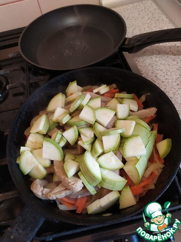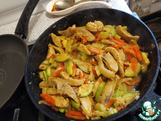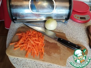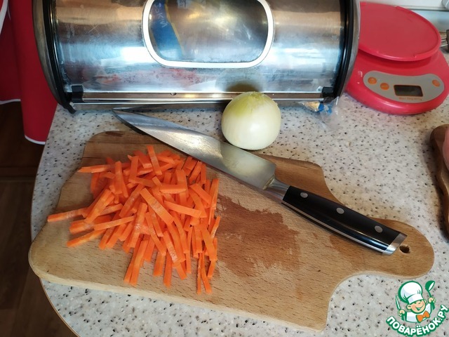 Тем временем нарезаем лук, морковь, кабачок брусочками.