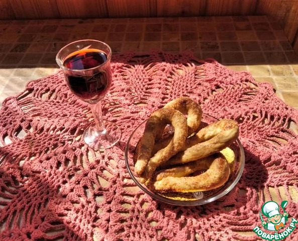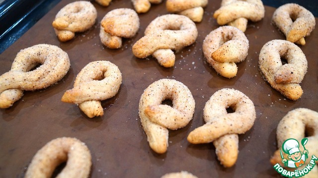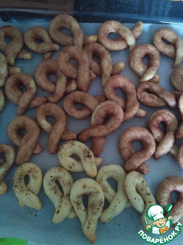 Скручиваем колечки, сжимая кончики или просто скрестив их, как я. Выкладываем на противень, который лучше застелить бумагой для выпечки или силиконовым ковриком. Выпекать при 200 градусах 10-12 минут до легкого зарумянивания, пересушивать не надо.