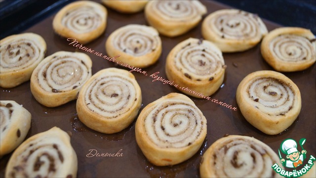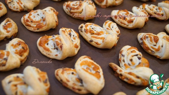 Но и на этом я не успокоилась. Тесто для следующего противня я тонко раскатала, посыпала сухой аджикой, солью, льняным семенем и моцареллой (чтобы не обидеть итальянцев своеволием). Скрутила рулетом, порезала и свернула крендельками. В итоге получилось очень красивое и вкусное печенье.