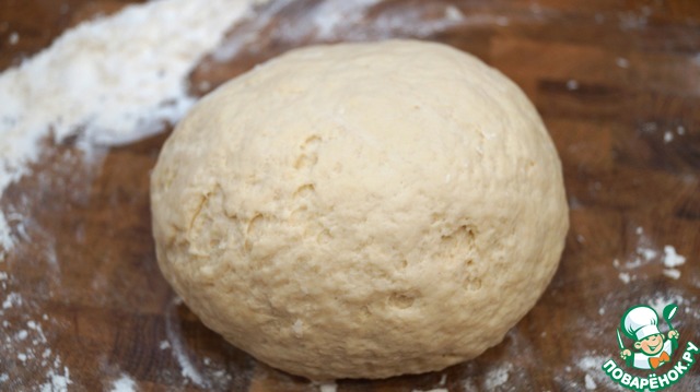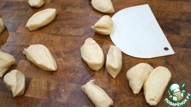 Готовое тесто немного помесим, разделим на части, скатаем колбаски и нарежем их на кусочки размером с грецкий орех.
