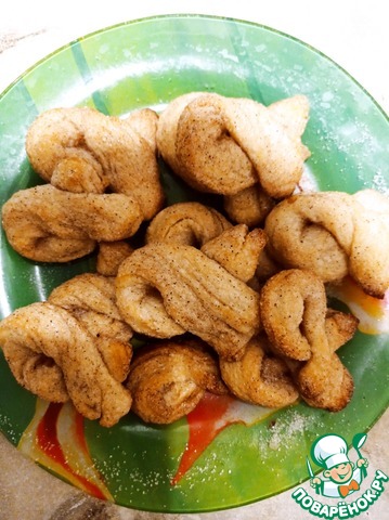 А дальше меня понесло... Я, как хорошая итальянская хозяйка, замесила не одну норму и у меня получилось много теста. Но, поскольку, хозяйка я все же не итальянская - терпения у меня куда меньше и мне просто надоело "вертеть" жгутики. В итоге, у меня еще получился противень крендельков с сахаром и корицей...