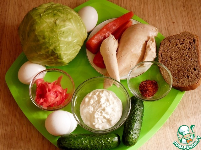 Вот такой несложный набор продуктов для приготовления этого салата. Для сочного вкуса добавим огурцы, а бОльшей сытности отварное мясо куриной грудки и ломтик хлеба, ржаного или солодового. Для заправки салата подойдет сметана или натуральный йогурт с добавлением яичного желтка. А также специи по вкусу, хорошо подойдет смесь для корейских салатов, в ней уже есть соль, поэтому досаливать надо уже готовый салат, если вам понадобится.