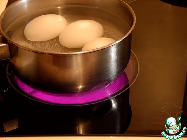 Яйца положить в холодную воду, довести до кипения, варить 4-5 минут. Сразу же слить кипяток и залить холодной водой. Белок в яйцах получится твердый, а желток сварится, но не будет очень сухим, в самый раз для добавления его в заправку для салата.