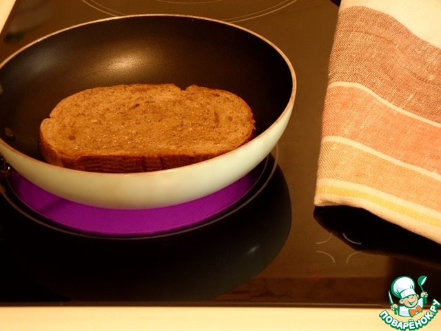Ломтик хлеба смазать с обеих сторон растительным маслом, обжарить на среднем огне в сковороде. Когда он хорошо поджарится, убавить нагрев до минимума и оставить для полного подсыхания. Хлеб должен стать хрупким, хорошо крошиться.