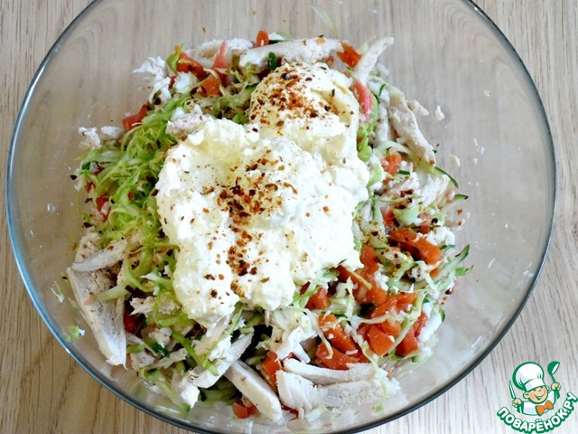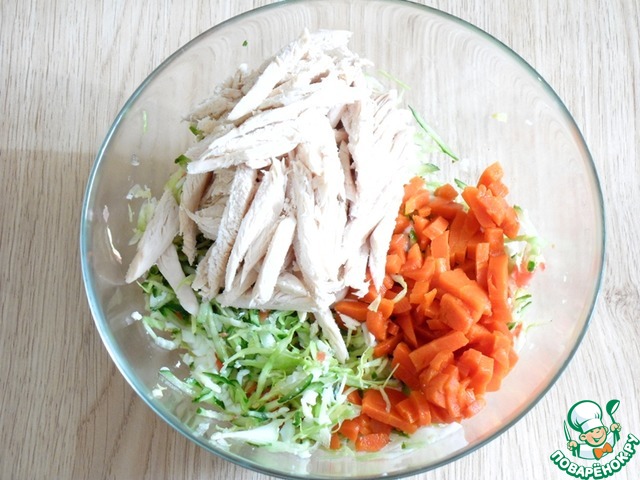 Теперь добавить самые "хрупкие" продукты - отварную морковь и филе. Аккуратно все соединить.