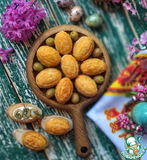 Половинки "скорлупок" начинить брынзой, по желанию добавить порезанные оливки. Соединить половинки.