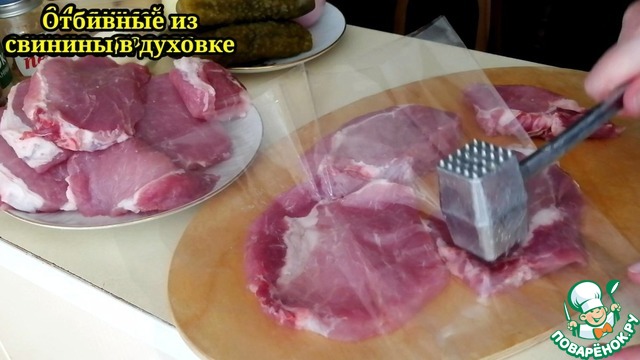 Для этих отбивных я взяла карбонад и порезала его на порционные куски. Слегка отбила каждый кусок с одной стороны.