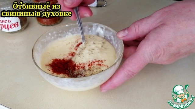Смешиваем все ингредиенты марина да для мяса, выливаем этот маринад в отбивные, и хорошенько перемешиваем, чтобы каждая отбивная котлета хорошо обмазалась этим маринадом. -