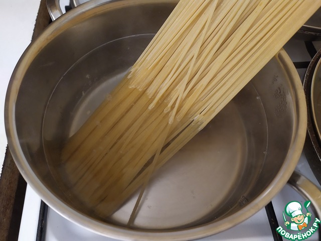 Т. к. соус делается очень быстро - сразу ставим спагетти на огонь.
