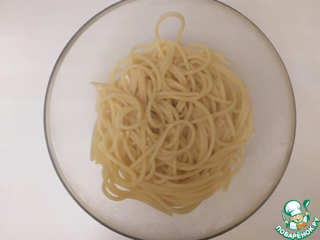 Как только спагетти приготовятся - начинаем действовать оперативно, чтобы они не остыли.