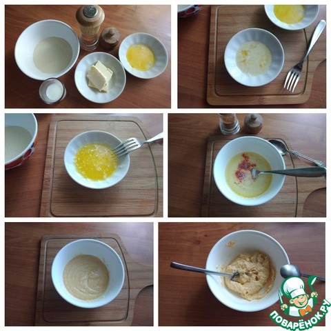 В посуду насыпаем манку, наливаем молоко, добавляем масляно-желтковую смесь, соль и перец.