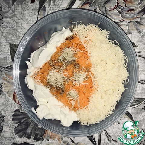 Морковь и сыр натереть на мелкой тёрке, присыпать одной щепоткой соли и двумя щепотками уцхо-сунели. Добавить сметану, хорошо перемешать и поставить в холодильник.