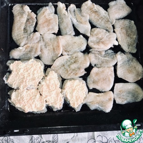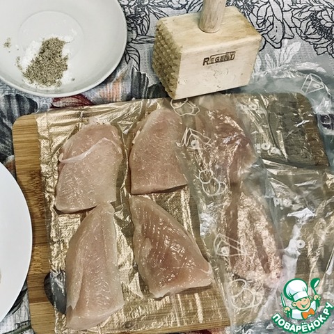 Тем временем нарезать филе продольно на некрупные кусочки толщиной около 1 см. Выложить на разделочную доску, застеленную пищевым пакетом, сверху накрыть ещё одним пакетом и слегка отбить с одной стороны.